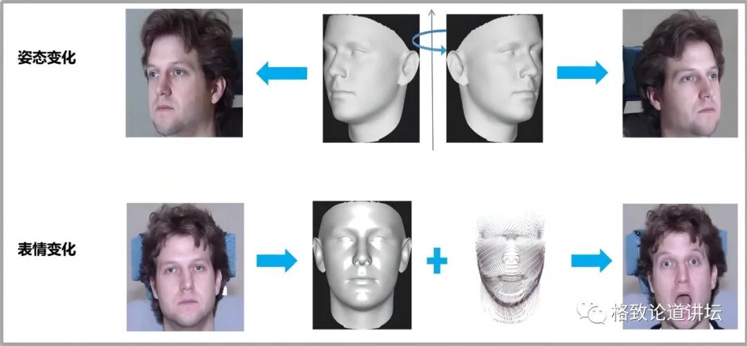 这种旋转行为就导致了人脸图片的姿态变化。下面这一行显示人的表情变化。也就是说,无论是姿态变化还是表情变化,都是在三维空间中发生的。