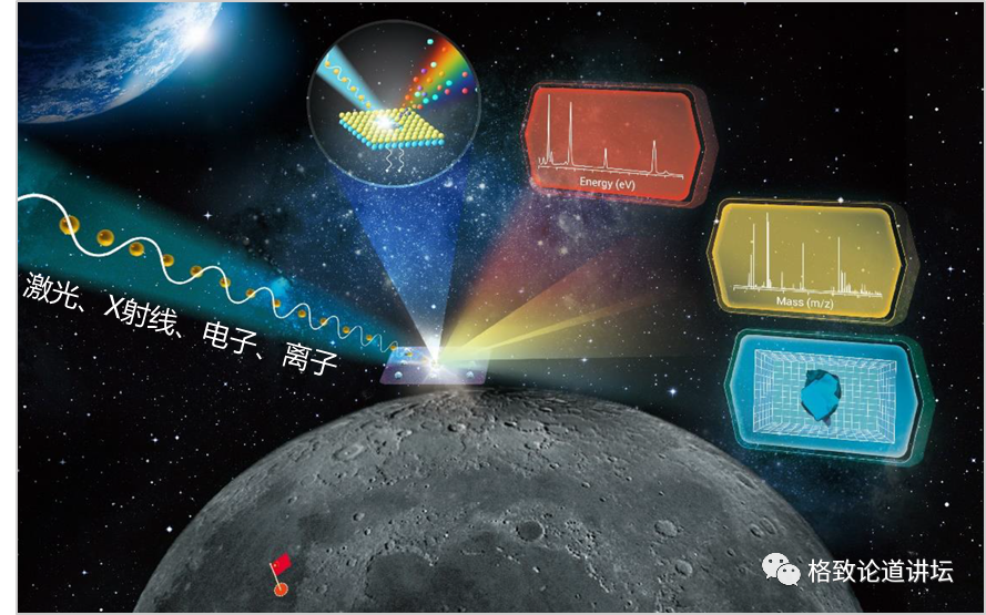 首先看一看我们要搭建什么样的平台。根据月壤样品的特点,我们不能去损耗它,所以我们要想办法用不损耗样品的方式,从样品中获得尽可能多的信息。所有的这些平台其实都可以想象成一个显微镜,它们的原理是类似的。你首先需要有一个源,这个源可以产生一束光、一束电子或者一束离子,然后照射在样品上;从样品中再激发出光、电子或离子,通过收集这些信号;我们就可以知道样品的形貌、结构和成分信息。