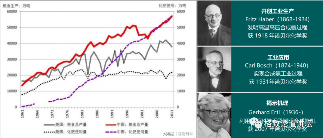 左图中的红线代表着我国的粮食总产量。在过去的几十年里,它差不多翻了3倍,其中合成氨功不可没。合成氨也得过3次诺贝尔奖,它的开创者哈伯被认为是“从空气中发明面包的魔术师”。