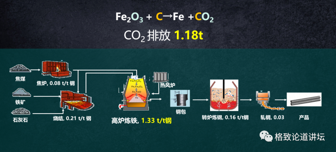 首先是钢铁行业。炼铁的过程可以理解为把三氧化二铁(Fe₂O₃)里面的氧去掉,然后得到金属铁。传统的高炉炼铁方式是用碳跟氧结合,这样就会产生二氧化碳。按照方程式的理论计算,每吨铁的二氧化碳排放大概在1.18吨。但制作钢铁的实际过程比这个复杂的多,是一个很长的流程。