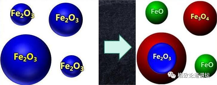 要进行氢气炼铁的话,显然需要进一步提高效率。效率怎么提高?其实从原理上来说也并不复杂,这里举一个例子。一个颗粒的反应时间跟它直径的平方成正比,如果用0.1毫米的颗粒跟10毫米的颗粒相比,它的速度会提高1万倍。所以用细颗粒就可以提高反应速度。