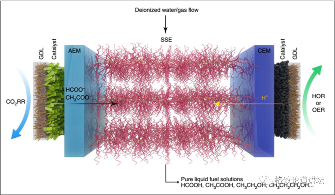 电化学反应是一类非常广泛的应用。像这张图所显示的,二氧化碳加水加上电子可以合成各种各样的化学品,这也是现在学术研究的热点问题。