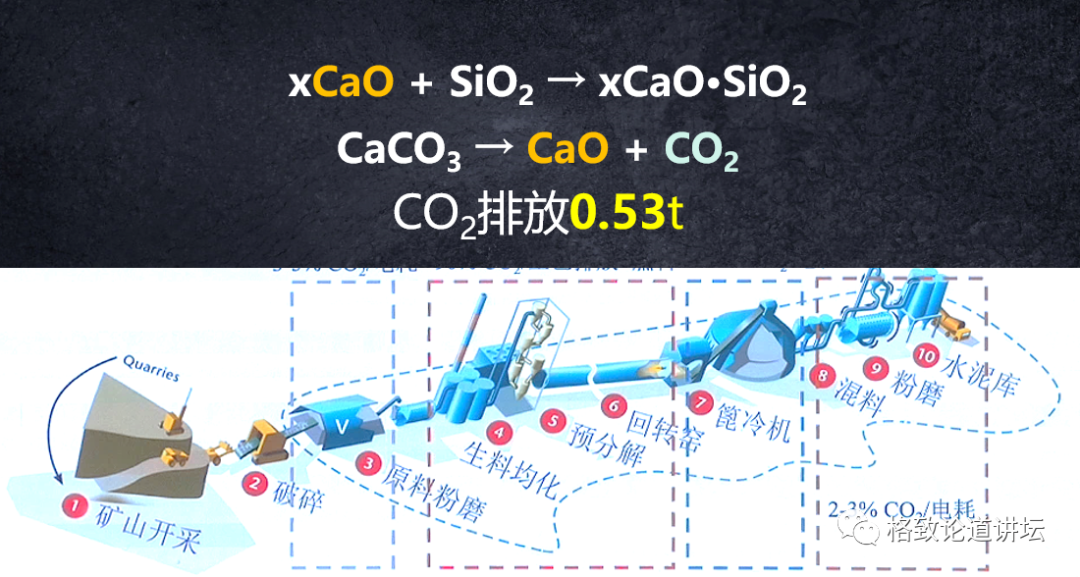建材中最重要的是水泥。烧水泥的过程基本上就是氧化钙(CaO)跟二氧化硅(SiO₂)反应生成硅酸钙。从方程式上看,其实没有二氧化碳的参与,但氧化钙的生产过程会放出二氧化碳。所以按照方程式计算,碳酸钙分解氧化钙的过程大约会排放0.53吨的二氧化碳。根据这个流程,1吨水泥熟料烧下来大概会排放0.9吨二氧化碳。