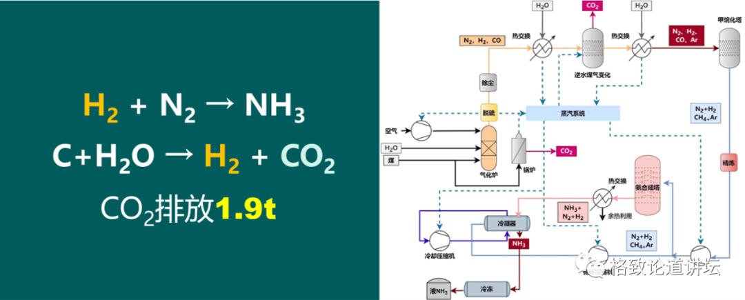 合成氨的化学反应看起来比较简单:氢气加氮气生成氨,所以这个方程式里面也没有二氧化碳。但是制造氢气的过程会产生二氧化碳,我们一般把这种氢气称为灰氢。按照方程式来看,制造1吨氨气需要排放二氧化碳1.9吨。虽然方程式很简单,但是合成氨的过程非常复杂,最终我们可能需要排放4-5吨的二氧化碳。