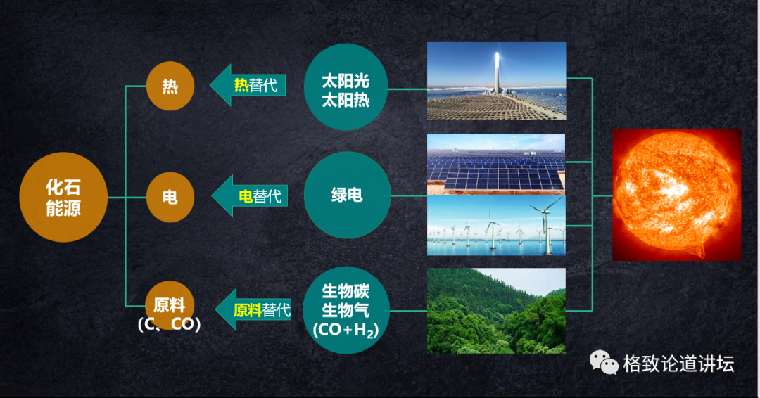 要对工业过程进行重塑,就是要替代化石能源。用什么来替代呢?显然我们可以用太阳能。比如我们可以通过聚光镜获得高品质的热源,这个热源就可以替代化石能源产生的热;第二,我们可以通过光伏、风电产生绿色的电力,它可以替代化石能源产生的电;第三,通过生物质可以产生生物碳、生物气,这也可以作为很好的替代原料。