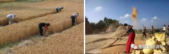 我觉得更重要的,是我们高质量发展的内生需求。在前三次工业革命中,我们国家都大幅落后于世界。比如在十几年以前,大家还在用上图的方式收粮食。