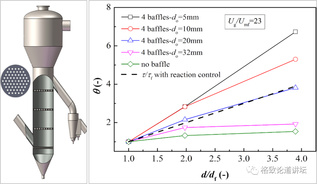 第二个方面,我们提出通过内构件去调控颗粒在流化床内停留的时间,让细颗粒待的时间短一点,粗颗粒待的时间长一点。我们建立了模型,建立了方法,确实可以实现这一目标。在右边这张图里,中间的虚线就是理论上不同大小的颗粒所需要的时间。可以看得到,我们通过调控,确实可以让它停留的时间与理论所需要时间完美地匹配起来,从而提高效率。