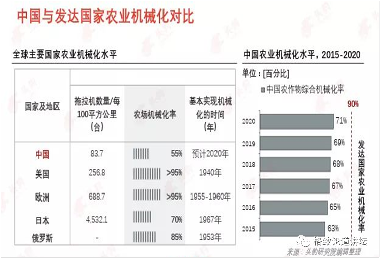 但是如果你看一看国外的情况,就会发现美国在1910年开始进行农业机械化,1940年就已经基本完成了。在1940年的时候,它的农业机械化已经达到95%,我们到现在可能才有50%。我想说的是,在别人已经跑得很远的情况下,我们想要追上它其实是非常困难的。即使你花了很多努力,想要超越也是艰难的。