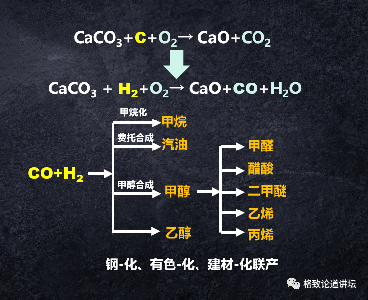 这样的话,通过与绿氢结合,工业二氧化碳就可以生成品类丰富的化学品。这些化学品原来需要通过化石能源来获得碳,现在就有钢化联产、有色跟化工联产、建材跟化工联产等途径,用联产的方式来降低碳的排放。