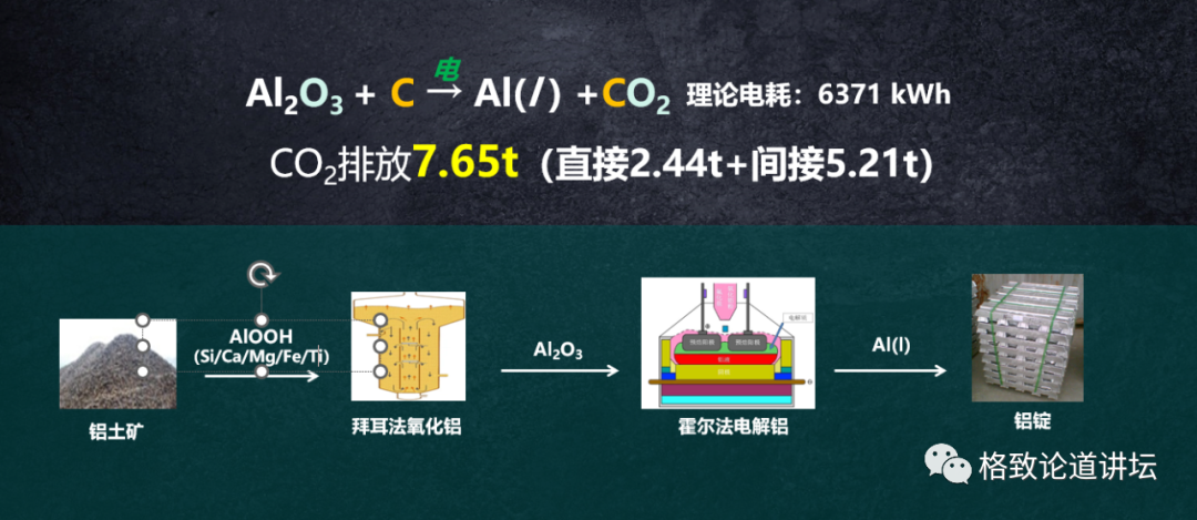 我们再来看看有色。有色的碳排放主要是由电解铝造成的,电解铝的过程其实也是把氧化铝(Al₂O₃)中的氧去掉。这时候仅仅靠碳就不够了,还需要电,整个过程的理论电耗大概在6300度左右。如果按照图中的公式进行计算,理论上说制作1吨铝可能需要排放7.6吨的二氧化碳。