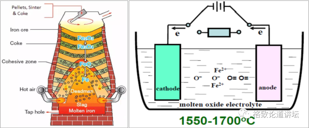 首先,我们可以通过电化学反应去替代传统的热化学反应。就像这两张图显示的,炼铁的过程需要通过碳还原三氧化二铁,事实上电很容易还原铁离子,铁离子得到电就生成铁,这是高中化学里面就有的反应。