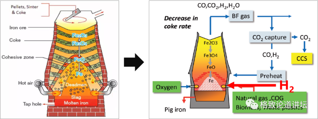 我们怎么去替代?有两种路径。第一,我们可以在高炉上修修补补,在高炉下面开一个口,然后把氢气通进去。这样氢气就可以与铁矿石反应,部分替代焦炭。它的好处是对现有流程的改动较小,但它的缺陷是不能通得太多,否则会对高炉的运行造成影响。这种方式大概能减碳20%。