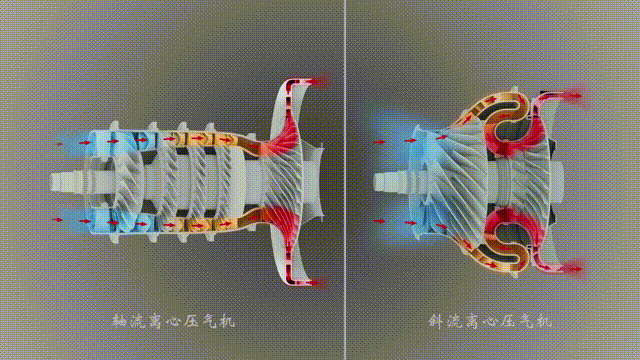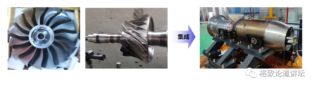 为此我们首先做了组合压气机。左边的是个传统的轴流加离心的压气机,右边这个图是我们的斜流加离心压气机。