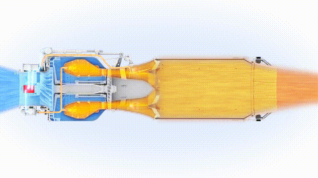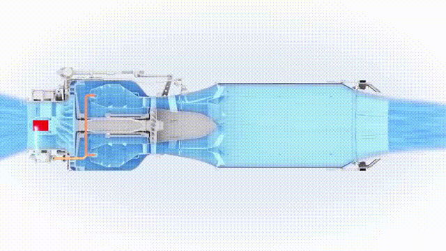 大家看到它的涡轮部分,就是后端靠近排气的部分有一个涡轮,它只有一根轴来驱动高压压气机和驱动风扇。这打破了传统的要靠双轴来工作的理念了。单轴结构简化了结构,让重量减轻20%-30%,同时滑油系统和附件传动系统被取消,重量减轻20%,成本下降30%。