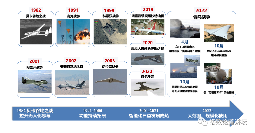 从此以后,它在历次热敏区域的战争当中都占据着非常重要的角色。尤其是最近的俄乌战争,大家也非常关注,无人机以它高空高速的飞行性能、低廉的价格和精准的控制,在战争天平上发挥着重要的作用。大家可以想象,如果没有无人机参与,乌克兰不可能轰炸俄罗斯的本土,也不可能炸毁舰队乃至潜艇。
