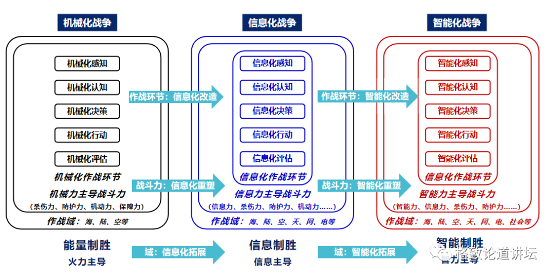 大家知道,第二次世界大战的制胜关键是机械化,以陆、海、空联合作战为标志。当前的战争则是信息化战争,特征是陆、海、空、天、网、电融为一体。目前来看,现代战争已经走到了以无人装备为主的智能化战争,以OODA(观察、判断、决策、执行)作战模式为代表,整个决策和打击过程都需要全要素的智能化决策。为此,《二十大报告》已经明确指出,我国也要“加快无人智能作战力量发展”。