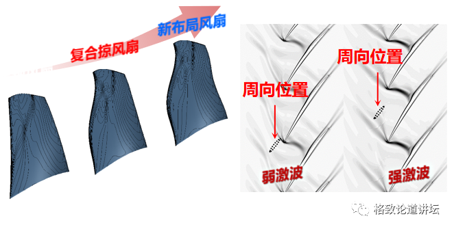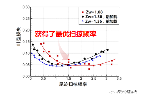 那么现在我们想个办法,拿上游的尾迹抑制它的流动分离和转捩。再拿叶型损失为目标函数,找到一个最佳的扫掠频率,它两个再向内旋转。有了这个最佳的扫掠频率,整个低压涡轮吸力面的流动分离就能够得到控制。