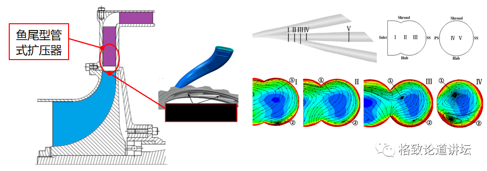 面对第一个挑战,对于压缩系统我们采用了一种鱼尾型的扩压器。利用这个扩压器就能把压缩系统的稳定裕度提高,从而解决有限空间下内部流动分离问题,同时也能够减少它的二次流损失。