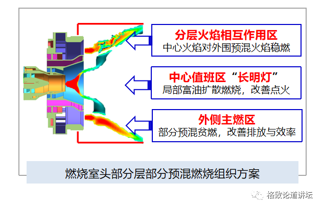 我们想的办法就是沿着它的径向进行分区燃烧。中心区域做富油的扩散燃烧,像一个长明灯一样,我们叫“值班火焰”。外围做预混贫燃,这样保证了燃烧效率和排放。通过径向分区,就能靠值班火焰来保证高空条件下的稳定燃烧。