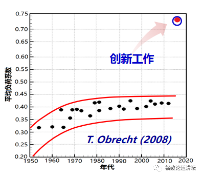 把流线径向抬高,向心加速度和流向加速度就会增加,从而增加径向的压力梯度,这样沿着流动方向的轴向压气机的负荷就能减少。通过这个创新,既能实现较高的压比,又能减少压气机的负荷,从而增大它的稳定工作裕度。从这个图能看出来,稳定裕度不变,负荷能够提高90%。