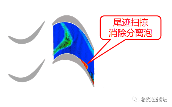 然后,为什么要讨论低压涡轮呢?由于低压涡轮的吸力面逆压力梯度比较大,中间会出现一个分离泡。分离泡上游的尾迹是一个高湍流度区域,能促使它转捩(从层流向湍流过渡),转捩以后这个分离泡可能附着。分离泡一方面增加了损失,同时还改变了流动的路径。