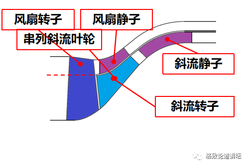 这是一个斜流压气机,前边蓝色的部分是一个导风轮。把这个导风轮沿着径向生长起来,就出现一个外涵道,风扇的转子和静子构成了风扇的外涵道。在内涵道里面,导风轮风扇串列斜流叶轮和斜流转子构成一个串联叶栅。串联叶栅能够实现很高的压比,还能够有很高的稳定工作裕度。