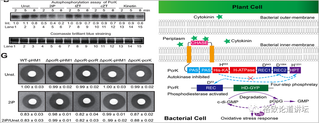 植物激素控制植物的生长和发育,可是我们发现了一个受体组氨酸激酶PcrK,它能直接感知植物激素、细胞分裂素的存在。而且感知后它就知道:我现在生活在植物寄主体内,植物很快就要用氧化胁迫来收拾我、杀死我。所以它马上就会启动一系列抗氧化胁迫的生理代谢,对抗寄主植物对它的伤害。