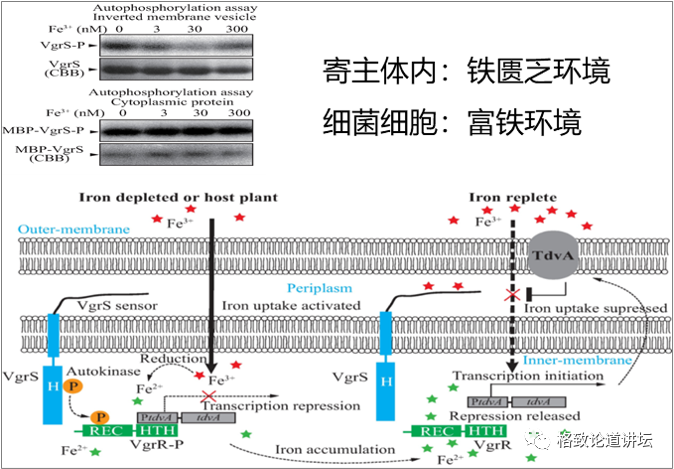 我们研究发现,细菌的细胞膜上有一种叫VgrS的受体组氨酸激酶,当细菌生活在植物体内,环境缺铁的时候它就会启动:我现在要吃很多很多的铁。但是铁吃多了,在细胞里蓄积得太多,又会有另一个受体感知到铁浓度太高,这个细菌就会停止吃铁。从这个角度来说,细菌比人更克制。