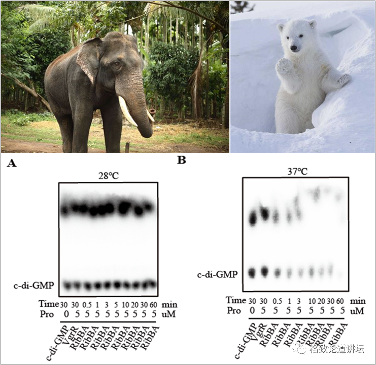 细菌能不能感知温度呢?可以的。我们发现了一个受体组氨酸激酶下游的蛋白,它的酶活性会随着温度的变化降解不同的底物。显然这个蛋白就是细菌的温度计,它马上就能知道自己生活在28度还是生活在37度。实际上很多哺乳动物的病原细菌能够感知到自己现在生活在37度,正好就住在人或者动物的体内。