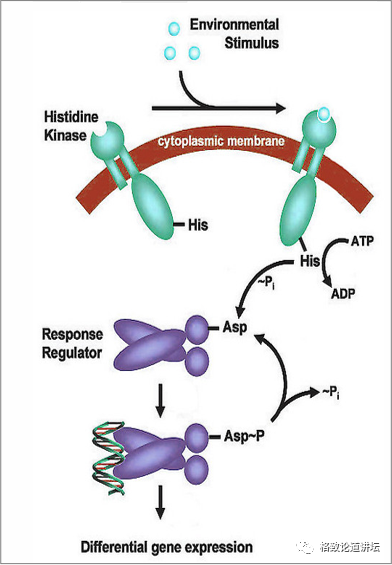 细菌的受体或者说细菌的智商是由什么东西决定的呢?人类的受体大部分是丝氨酸、苏氨酸或者酪氨酸激酶,细菌的智商绝大部分是由一种叫“双组分信号转导系统”的系统控制的。这个系统是世界上最简单的信号系统,因为就由两个蛋白组成。
