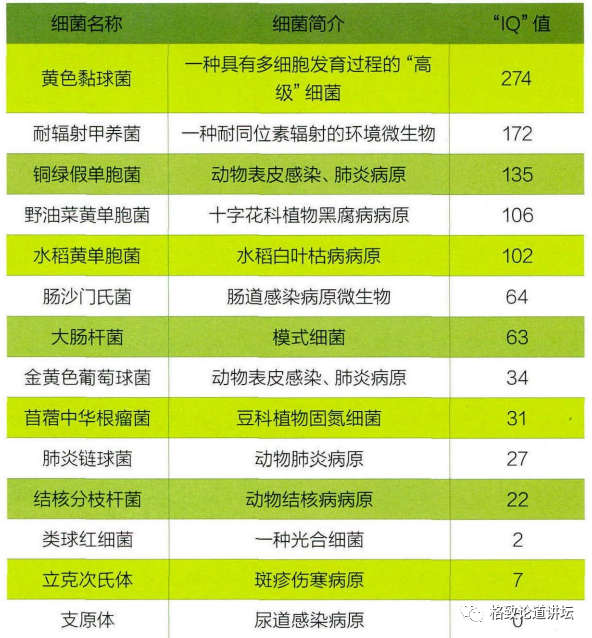 细菌里面的天才、智商最高的细菌叫做黄色黏球菌。这种细菌非常厉害,它会吃别的细菌,智商大概接近300。大家熟知的大肠杆菌,还有一会儿会介绍的、我实验室研究的野油菜黄单胞菌,它们的智商大概超过60,基本是高智商的生物。