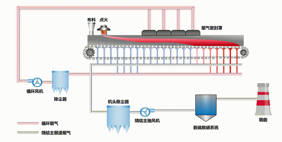 但这个过程显然存在两个问题。一个问题是烧结作为燃烧过程,对氧气量是有要求的。如果不断地把混合后的烟气循环往复,就不能保证氧气含量。再一个问题就是混合后的烟气里面含有大量的水分、粉尘等有害组分,这个也会给烧结机的生产带来巨大压力。