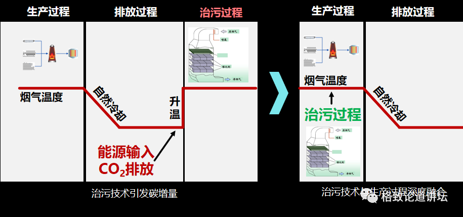 所以在超低排放里面,我们注意到含氮氧化物的烟气的排烟温度是120℃到160℃,而对它进行选择性催化还原(SCR)脱硝反应的温度需要260℃以上,所以一般都是需要加热才能完成。这个过程就产生了巨大的能耗,增加了很多碳排放量。