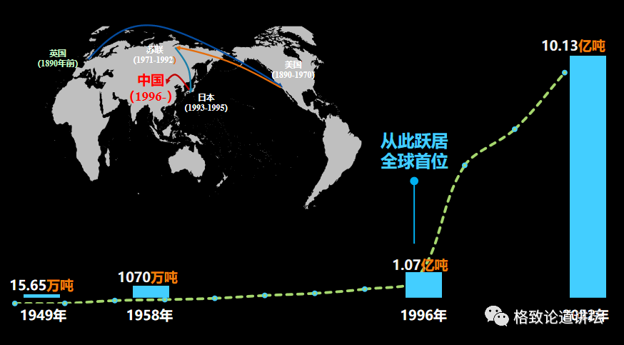我给大家回顾一下中国粗钢产量的发展历程。在1949年的时候,我们国家的粗钢产量仅有15.65万吨,产量非常低。到了1958年产量首次突破1000万吨,到1996年我们的粗钢产量超过了1亿吨。从那个时候开始,世界钢铁的生产中心就从日本转移到了中国,到今天中国仍保持着这个世界地位。2020年我国粗钢年产量首次突破了10亿吨,占到了全世界钢铁产量的50%以上。
