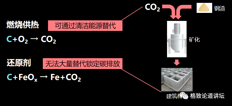 第二步是在生产过程中固碳。燃烧碳可以通过清洁能源替代,作为还原剂那部分碳还是会产生大量二氧化碳。我们的解决思路就是,用钢铁产生的碱性废渣和二氧化碳相结合,通过矿化实现产物的高值化利用,从而固锁定之碳。