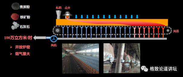 我先简单介绍一下钢铁的烧结过程。我们需要把烧结原料,包括焦炭粉、铁矿粉、石灰石等全部铺在烧结机台车表面。生产时,首先点火,通过下面的引风机把排放的烟气抽出来,从而使烧结矿逐渐地从上到下燃烧,所以烧结机也被称为一个开放的炉窑。在这个过程中,台车一直在缓慢移动,烟气不断地通过下面的多个不同风箱被全部抽出。