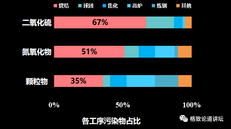 我们对各个工序污染物的占比进行了总结和比较。从这个图中可以非常清晰地看到,钢铁行业烧结工序排放的二氧化硫、氮氧化物、颗粒物分别占到钢铁行业污染物总量的67%、51%和35%,所以烧结工序是实现超低排放的“卡脖子”环节。钢铁行业的大气污染物要得到有效控制,首先要减少烧结工序排放的污染物。