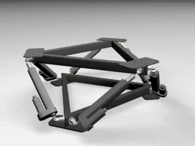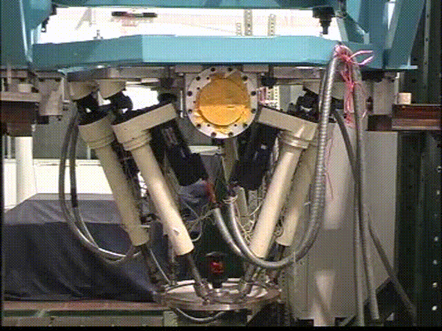 后来,我们研究了一个“外柔内刚”的方案:用外面的6根绳索来实现大的运动空间,并把设备送到差不多的位置;然后在里面加一个刚性的机构,来实现它的俯仰角度和定位精度。大家请看下面的图片,是不是有点像我刚刚展示的并联机器人图片?它就是一个6杆并联机器人,只不过它反了过来。