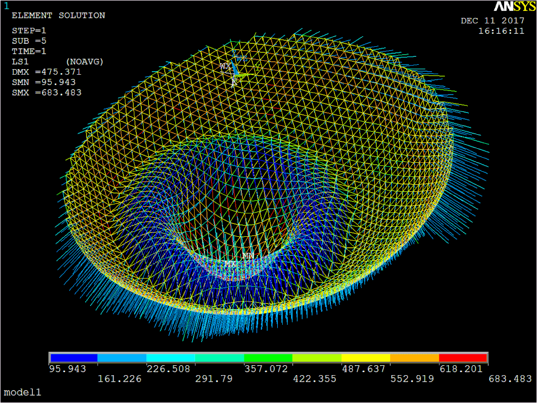 请大家看着上方动画想象一下,一个大大的网兜被吊在了500米口径的圈梁上,这是一个钢结构,把网兜外面的那一圈给固定住了。网兜中每一个三角形的顶点处都是一个结点,一共有2225个结点。图中散发出的短短的蓝线,就是朝向地面的下拉索。如果每一个下拉索下面都有一个驱动装置的话,我们就有2225个驱动装置去驱动这些蓝色的小索,让整个索网产生变形。