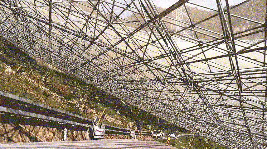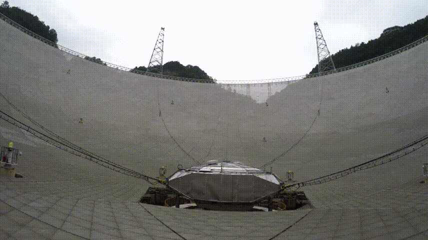而为了尽可能地减小这种损失,阿雷西博用了一个非常复杂的馈源支撑机构,就是上图中悬在高空的白色架子。它是一个非常大的桁架结构,上边有个导轨,用来装一个小馈源舱,馈源接收设备就放在馈源舱里面,来进行小范围的运动。它只能依靠地球的自转和自身的小范围运动,来实现大概20度的观测天区。