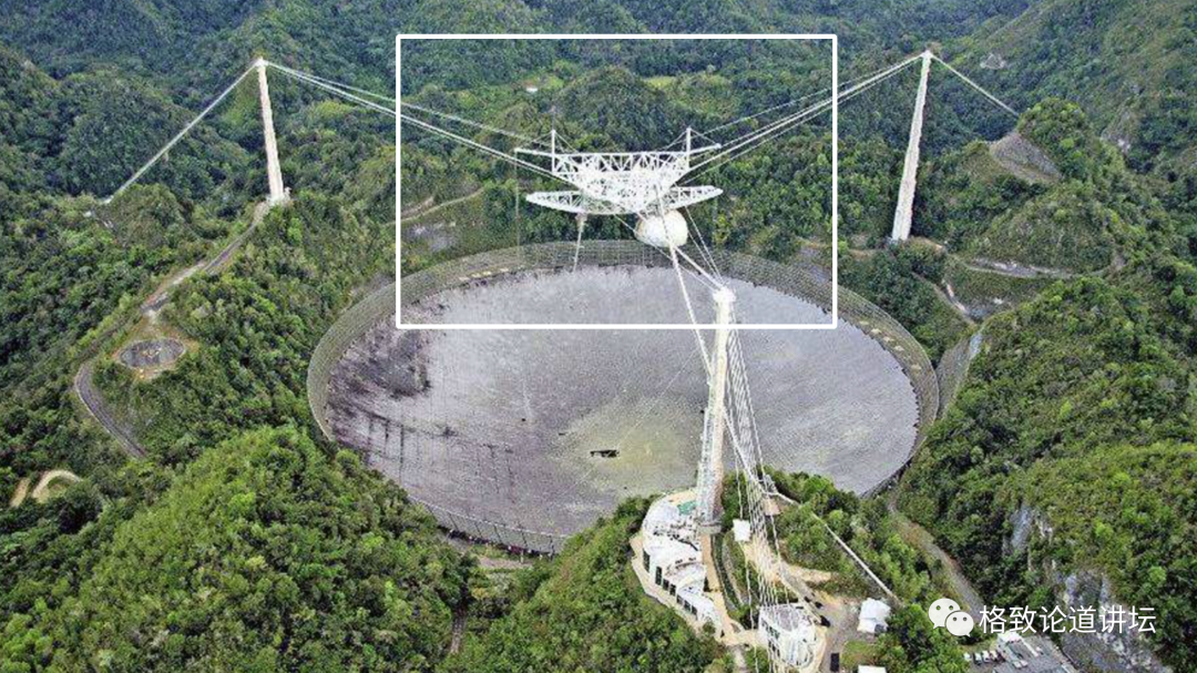 而我们想观测得更大,得到的信号更多,也想观测到更暗弱的信号。而且像阿雷西博这样的望远镜,我们真的也建不成。因为尺度更大了之后,重量是呈指数上升的,所以中间的这个馈源支撑系统可能要有上万吨重,这在结构安全的层面上是不可行的。那该怎么办呢?