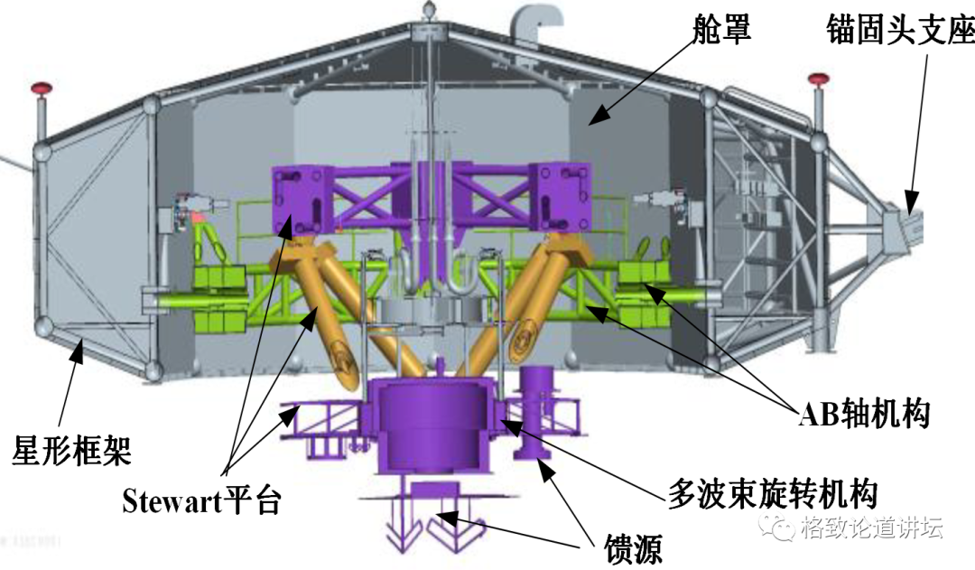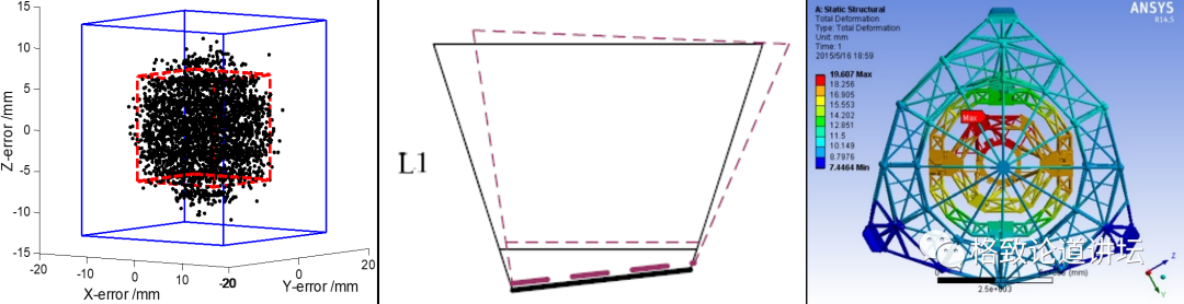 30吨的限值不能变,我们该怎么办呢?馈源舱里非常重要的一个结构就是6杆并联机器人(上图中的Stewart平台),它是用来实现最终的精度的。也就是说,馈源舱精度是最高的一个性能要求。我就根据这个精度进行了分解,来了解到底哪些结构的变形对于精度影响最高,哪些影响微乎其微。这样在设计的时候,影响高的地方,我就给它加一些结构来让它更结实,它的结构变形就会小一些,对终端的控制影响也会小一些;在影响并不大的地方,只要满足安全,就放一放它。就这样,我们最终用29.6吨完成了这个任务。
