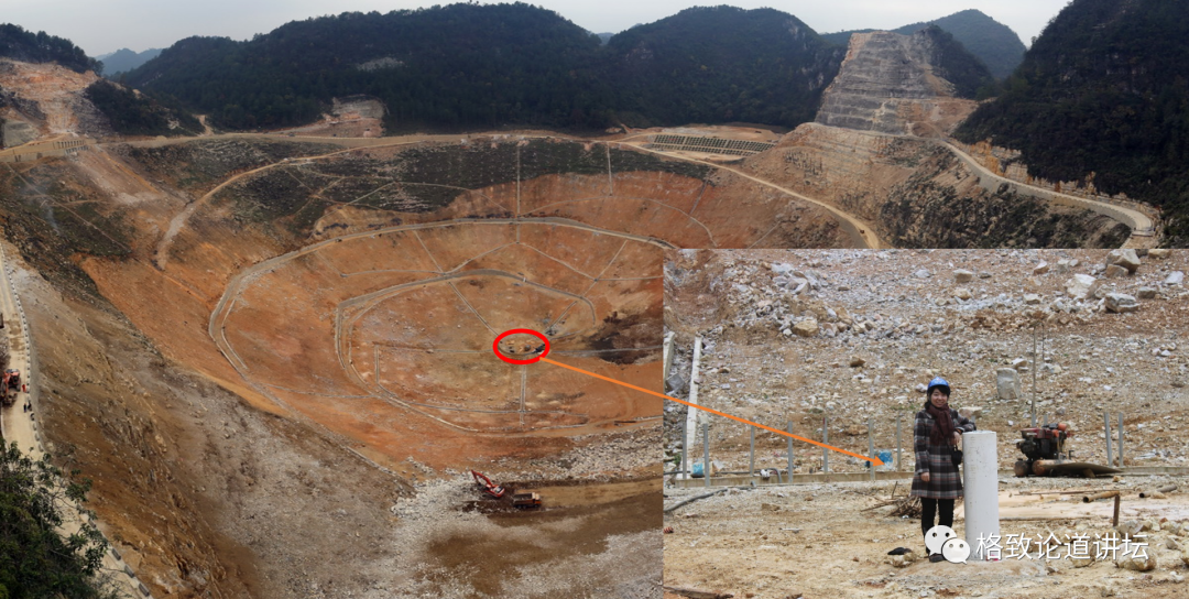 上图是2012年底时,我第一次到了开挖后现场的照片,我站的地方就是之后要建馈源舱的地方。图中红色圆圈标注的尺寸大概就是40米,所以当我真正站到这个地方的时候,我突然觉得40米和600米比起来,简直就是小巫见大巫了。