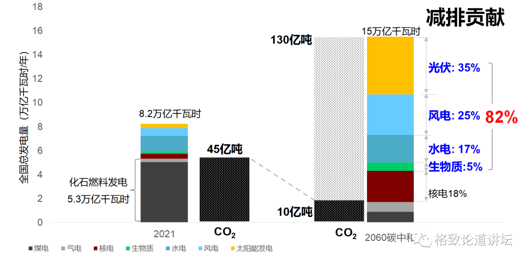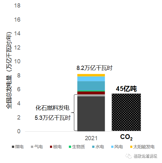 从这张图上大家可以看到,2021年我国的全国发电量是8.2万亿度,其中有5.3万亿度来自于化石燃料发电,二氧化碳排放量高达45亿吨,占到了全国当年总排放量的45%以上。因此,电力部门的减碳迫在眉睫。