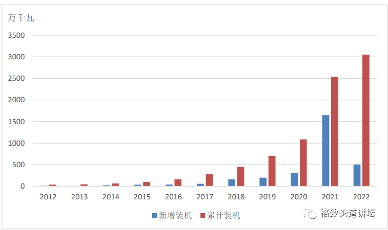 我国的海上风电目前处于什么样的发展阶段呢?这张图显示的是2012-2022年中国海上风电发展趋势。从中可以看出,中国海上风电发展十分迅速,尤其是2020年提出“双碳”目标以后。