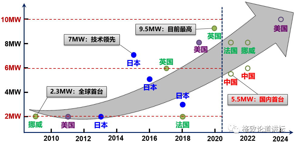 这是全球海上漂浮式风电机组的发展情况。在2009年,挪威研制出了世界首台2.3兆瓦的风电机组,它是一台漂浮式风电机组。而我国在2021年才研制出首台5.5兆瓦风电机组。相较于国外,我们落后了十几年。