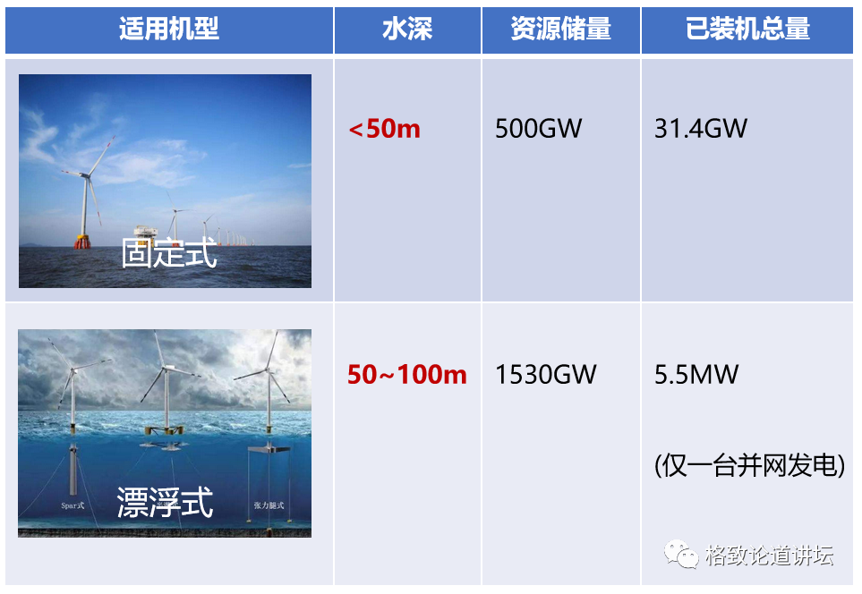 我们可以看到,相较于深远海的风资源,我国的近海风资源储量处于劣势,储量大约为500吉瓦(GW),而深远海的风资源储量是近海的3倍以上。目前,我国已开发的近海风资源装机总量为31.4吉瓦,但是在深远海我国只有一台样机做到了并网发电,也就是三峡“引领”号。它的装机容量是5.5兆瓦。可以说,我国深远海的风资源基本上处于未开发状态。