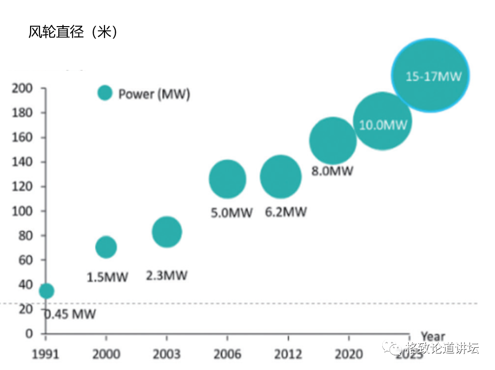 海上风电机组在吊装、运输、安装以及后期运行和维护的过程中成本都非常高。为了降低度电成本,海上更适合安装超大型风电机组。目前的陆上风电机组容量基本上都是6兆瓦,最大的是8兆瓦。但是海上风电机组容量一般是5兆瓦起步。