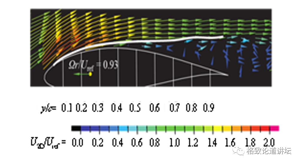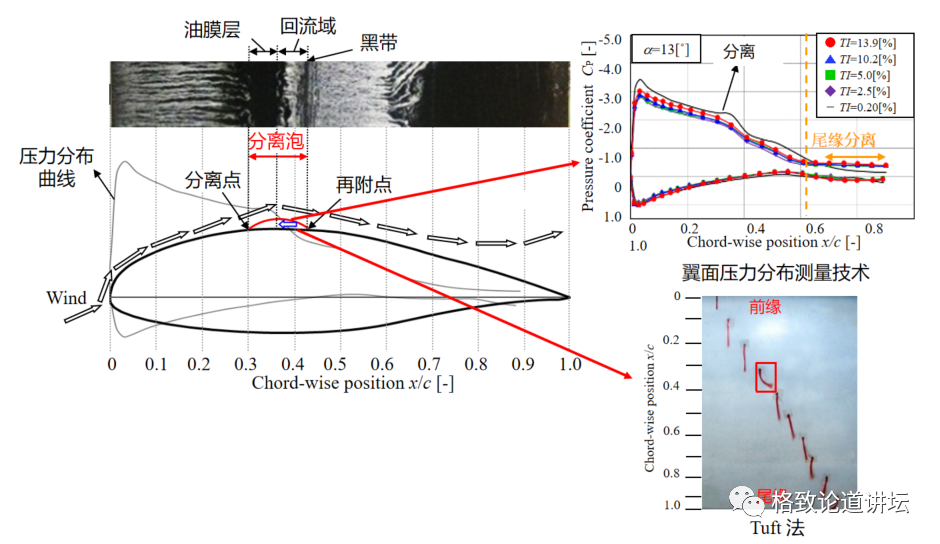 我们小时候玩水时,把手指头伸到水缸里一划,后面就会出现漩涡。气动也是这样的,气流从叶片表面发生流动分离之后,也会产生一个漩涡,也就是再附着现象,这个也捕捉不到。所以,我们采用了一个叫油膜法的新技术(上图左上),这样就可以观察到分离泡的大小。