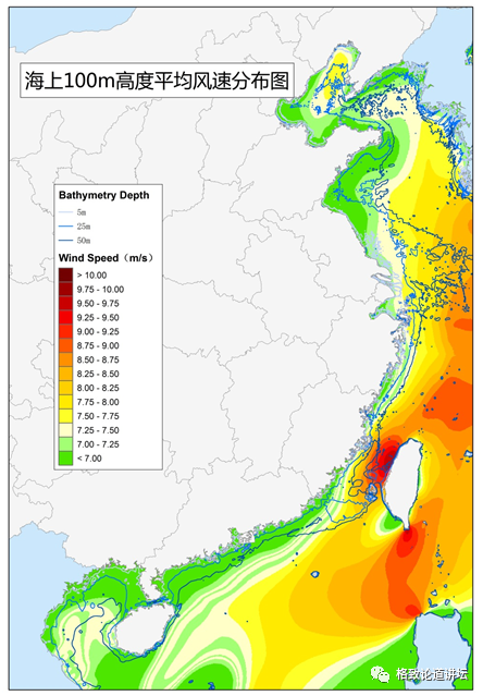 对更长叶片的追求也是由我国的风资源情况决定的,这是我国海上100米高度平均风速分布图,颜色越深代表平均风速越高。